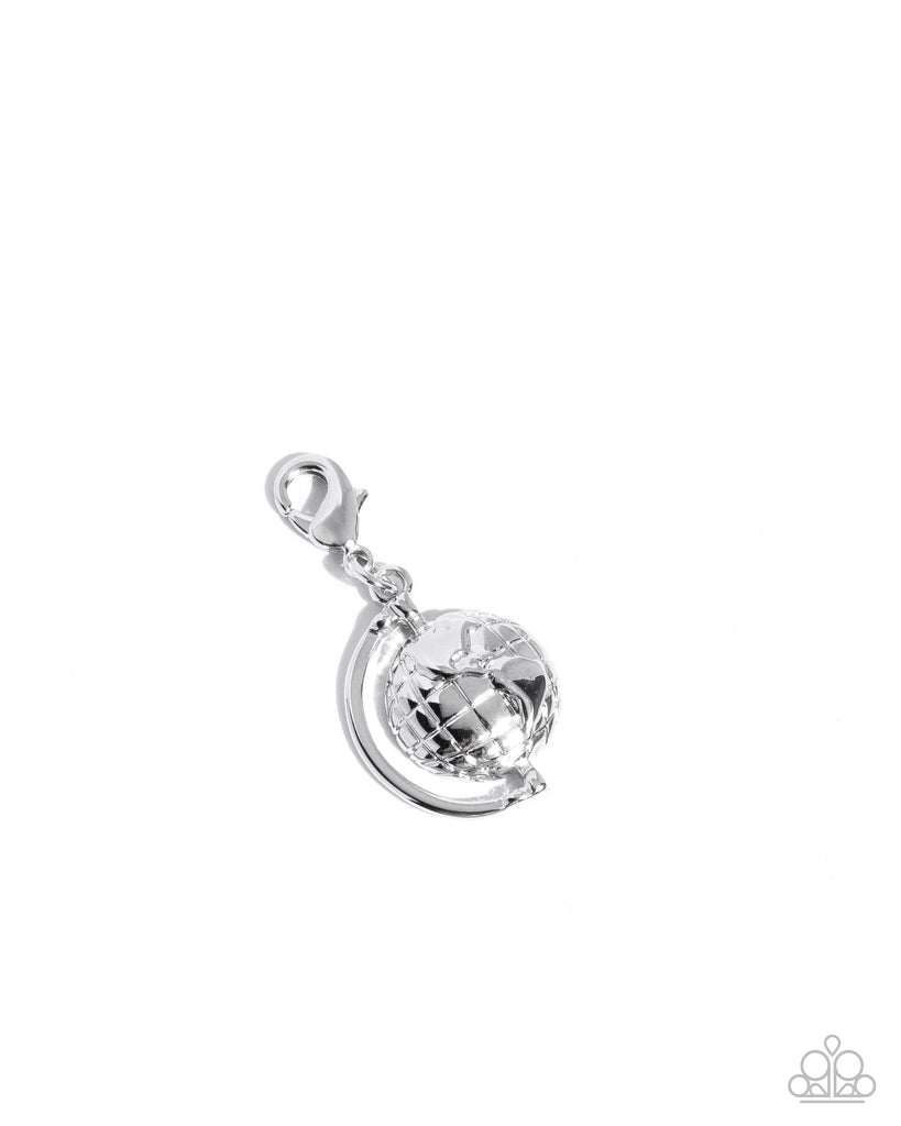 Featuring a high sheen, a textured rhodium plated globe sitting inside a frame, reflects light in every direction. Features a clasp closure. Can be attached to a variety of chains for a worldwide whimsical design. Charm measures approximately 3/4" in length.